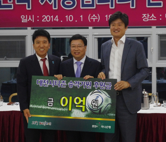 이 자리에 함께 참석한 하나은행 충청영업그룹의 함영주 대표는 이 날 행사에서 대전시티즌의 승격을 기원하며 대전시티즌 김세환 대표에게 후원금을 전달했다.
