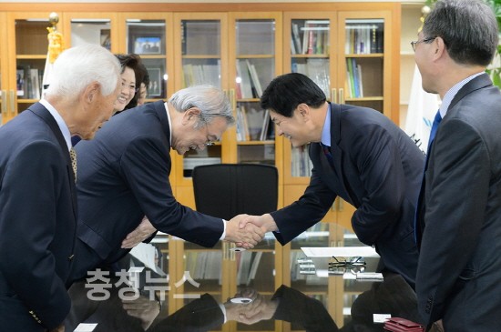 ▲ 이춘희 시장이 재일관동지구 충청도민회 유기환(柳箕桓)회장 등 4명을 맞이하고 있다.