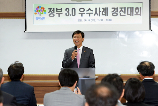 충남도는 8일 도청 별관에서 안희정 지사, 도와 시‧군 공무원 등 40여명이 참석한 가운데 ‘2014 정부3.0 우수사례 경진대회’를 개최했다. 이번 대회는 도민이 체감할 수 있는 정부3.0 4대 전략분야(일하는 방식, 투명‧유능‧서비스 정부)별 우수사례를 발굴하고, 이를 도와 각 시‧군이 공유할 수 있도록 하기 위해 마련했다.