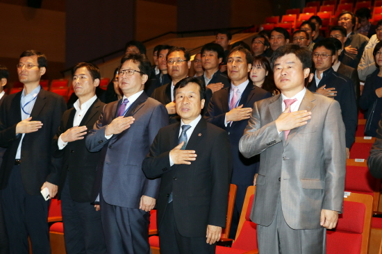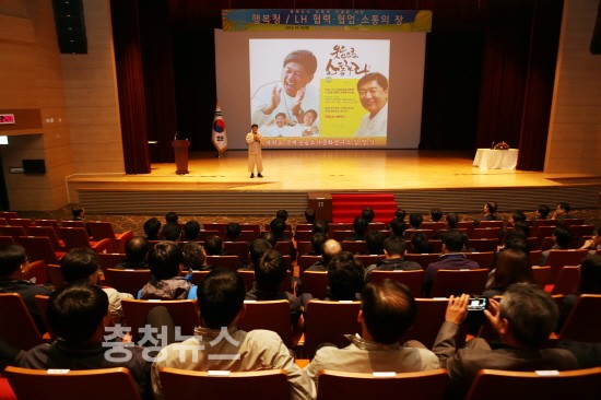 16일 행정중심복합도시건설청(청장 이충재 오른쪽에서 두번째)과 LH 세종특별본부(본부장 조현태) 직원 300여명은 정부세종청사 대강당에서 성공적인 명품 행복도시 건설을 위하여 상호 협력ㆍ협업ㆍ소통 하는 시간을 가졌다.
