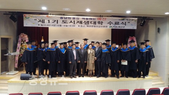 예산군은 18일 청소년수련관에서 제1기 도시재생대학 수강생 등 약 70여명이 참석한 가운데 ‘2014년도 제1기 도시재생대학 수료식’을 개최했다. 올해 처음 열린 도시재생대학은 전문가의 도움을 받아 주민 스스로 마을의 현안을 발굴하고 대안을 직접 만들어보는 ‘상향식 도시계획 프로그램’이다.