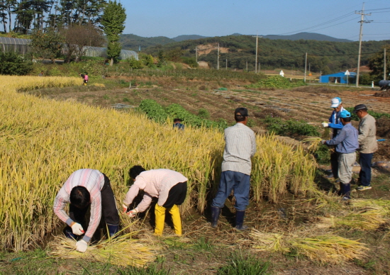 동네주민 등 1백여명이 참여한 가운데 벼베기를 진행