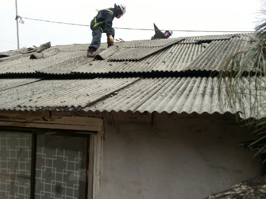 ▲ 석면 처리 위탁업체 직원들이 지원가구의 지붕 슬레이트를 철거하는 장면