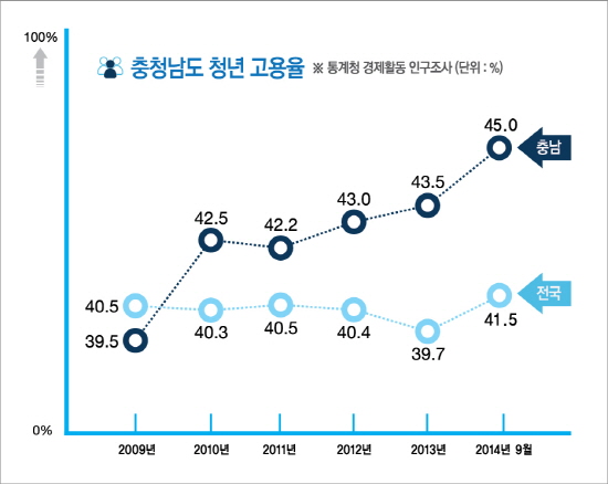 충남도내 청년 고용률은 ▲2009년 39.5% ▲2010년 42.5% ▲2011년 42.2% ▲2012년 43.0% ▲2013년 43.5% 등으로 지속적인 상승세를 보이고 있다. 전국적으로는 ▲2009년 40.5% ▲2010년 40.3% ▲2011년 40.5% ▲2012년 40.4% ▲2013년 39.7% 등으로 하락세를 면치 못하다 올 들어 소폭 상승했다.