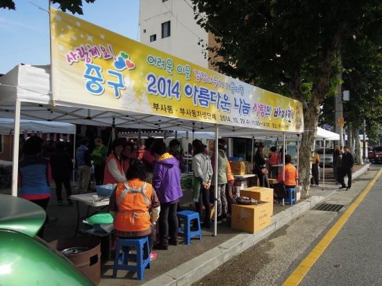 대전 중구 부사동(동장 박권흠) 자생단체는 어려운 이웃을 돕기 기금마련을 위한 사랑나눔 바자회를 개최하였다. 이번 바자회는 30일 부사동네거리 앞에서 먹거리와 농수산물을 판매하여 자생단체회원, 지역 주민 등 300여명이 참여했다.