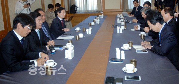 대전·충남·충북·세종 4개시도 국회의원들로 구성된 새정치민주연합 충청권의원협의회가 3일 오전 11시 국회 귀빈식당에서 회의를 열고, 헌법재판소의 국회의원 선거구 위헌 판결에 따른 충청지역 정치권의 공동대응책을 모색했다.