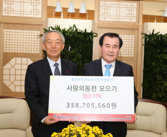 한편, 충남도교육청과 충남도사회복지공동모금회는 지난 2005년부터 ‘저소득가정 학생 성금 모금’ 업무협약을 맺고, 사랑나눔 동전모으기를 비롯해 ‘사랑의 수호천사’, ‘희망나눔캠페인’ 사업을 통해 매년 10억 여 원을 모금해 생계비(1720명), 의료비(50명), 대학입학 학자금(20명) 등으로 도움을 줬다.