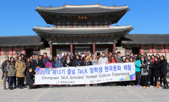 충남도교육청(교육감 김지철)은 13-14일 서울, 경기 일원에서 제13기 TaLK(정부초청영어봉사) 장학생 64명을 대상으로 한국전통문화체험 및 수업전문성 신장을 위한 연수를 실시했다.