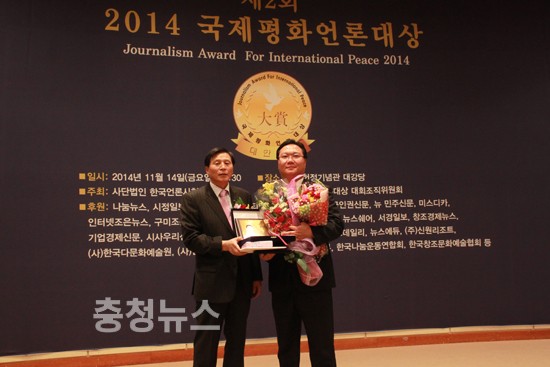 충남도의회 유병국 의원(천안3)이 14일 국회헌정기념관에서 열린 2014 국제평화언론대상 자치의정 공헌 부문 최우수상을 수상했다.