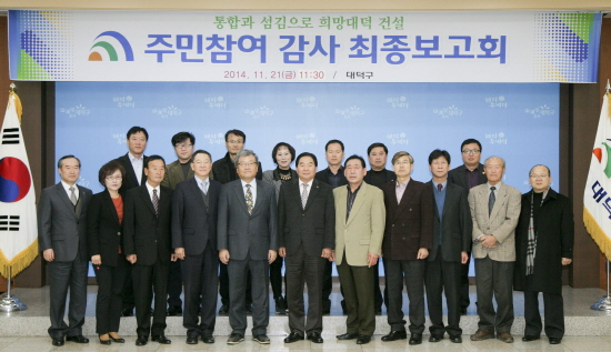 대전 대덕구(구청장 박수범)는 지난4일부터 21일까지 18일간 주민참여감사를 실시한 후, 21일 최종 보고회를 채택하고 감사일정을 마무리 했다.
