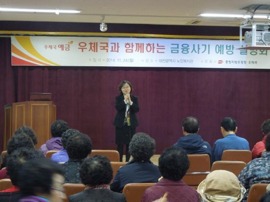 충청지방우정청(청장 김영수)은 24일 대전광역시 노인복지관에서 지역 어르신 150여명이 참여한 가운데 대포통장 개설 방지와 전화금융사기 피해 예방 설명회를 개최했다고 24일 밝혔다.