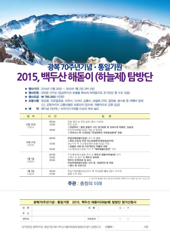 ◆ 2015년 광복 70주년을 맞아 통일을 기원하는 백두산 천제 및 해돋이 행사에 참여 하실 분들은 충청의 미래 담당 ☎ 010- 2679 -2249
