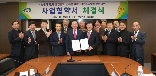 천안시는 28일 시청 중회의실에서 동남구 성남면과 수신면 일원에 조성한 천안제5일반산업단지의 입주(분양)를 위하여 대전충남양돈농협과 사업협약(MOU)을 체결했다.
