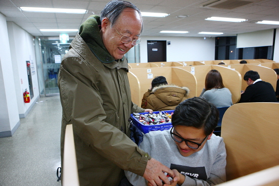 이날 사탕바구니를 들고 도서관에 나타난 김 총장은 일일이 학생들에게 한주먹씩 사탕을 주면서 좋은 결과가 있기를 기원했다. 김 총장은 매학기 시험기간에 사탕바구니를 들고 중앙도서관으로 향해 학생들에게 친근하게 다가서고 있다.