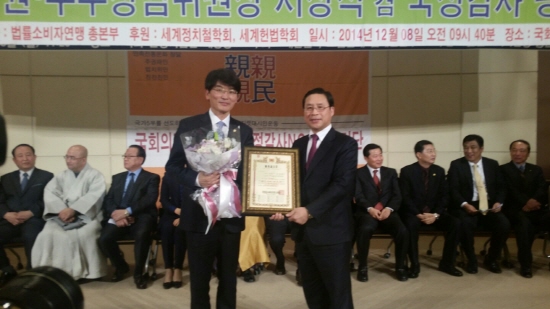 국정감사 NGO모니터단은 8일 오전 헌정기념관 대회의실에서 박완주의원에게 19대국회 제3차년도 우수의원을 시상했다. 박 의원은 19대 들어 3년 연속 우수의원상을 수상했다.