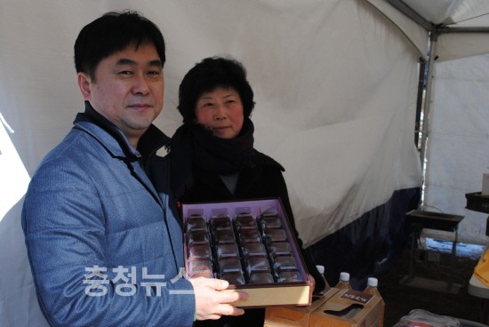 ▲ 새정치민주연합 김종민 지역위원장(논산/계룡)이 이환주씨가 재배한 곶감을 맛을 홍보하고 있다.