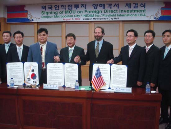 대전광역시는 1일 오전, 시청 대회의실에서 미국 기업인 INEXIM(대표 이성재)社와 Playfield International(대표 Stephen Lee Linville)社 등 2개 기업과 대덕테크노밸리 외국인투자단지에 총 1,400만 불을 투자하는 양해각서(MOU)를 체결했다.