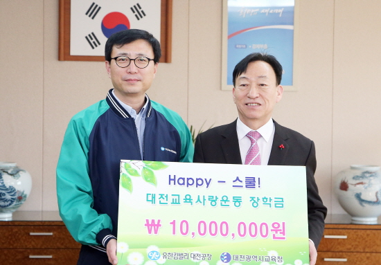 대전시교육청(교육감 설동호)은 18일 오전 10시 시교육청 교육감실에서 유한킴벌리 대전공장(공장장 신봉철)로부터 Happy 스쿨 장학금 1천만원을 기탁받았다고 밝혔다.