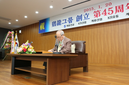 ▲ 20일 오전 10시 대전 탄방동 둔산사옥에서 열린 계룡건설 창립 45주년 기념식에서 이인구 명예회장이 그룹 사장단과 임직원들에게 기념사를 하고 있다.