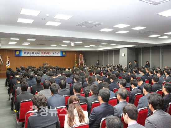 계룡건설은 20일 오전 10시 대전 탄방동 둔산사옥 16층 강당에서 이인구 명예회장을 비롯해 한승구 사장, 이승찬 사장 및 계열사 사장단과 임직원, 협력업체 사장단 등 500여명이 참석한 가운데 창립 45주년 기념식을 개최했다.