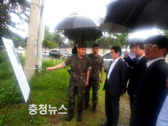▲ 천안시 서북구 제3탄약창에서 국가권익위원회와 박완주 의원 등이 참여한 가운데 육군 관계자들이 군사시설보호구역 내용을 현장 브리핑하고 있다.