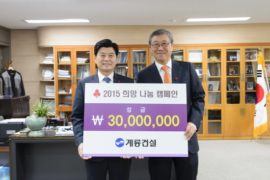 세종시 신도시 건설에 참여하고 있는 계룡건설(명예회장 이인구)에서 지난 4일 한승구 사장(사진 오른쪽)이 세종시를 방문해 어려운 이웃을 위해 써 달라며 성금 3000만원을 기탁했다.