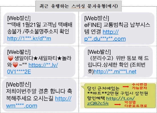 설날이 다가오면서 「택배 배송경로 실시간 확인」, 「선물 확인」 등 다양한 내용의 문자메시지로 스미싱 문자메시지가 발송될 것으로 예상된다.