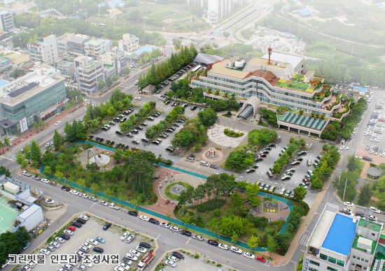 ‘그린빗물인프라 조성사업’은 저영향개발기법(LID)을 도입 청사내 소규모 분산식 빗물관리 시스템을 조성해 강우유출 저감을 통한 물순환 구조개선, 경관가치 향상, 비점오염원을 관리하는 사업으로 청사 내 투수블럭 주차장 조성과 식생체류지, 옥상녹화, 식생수로, 나무여과상자, 침투도랑을 조성하는 사업이다.