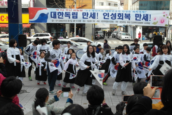 대전시는 3월 1일(일) 오후 1시 30분에 시민과 청소년 500여명이 참여한 가운데 으능정이 거리에서 대전국학운동시민연합과 대전국학원 공동으로 자랑스러운 국경일 태극기 플래시 몹(독립만세운동) 행사를 개최했다.