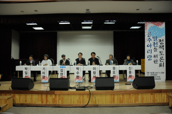 이날 토론자로 참석한 신용희 금강뉴스 대표는 △공주 아리랑을 시민들에게 널리 알리기 위해 백제 문화제 개최에 맞추어 공주 아리랑 참관을 통한 홍보 확대 △웅진성 퍼레이드 행사 시 공주 아리랑을 불러 시민들에게 알릴 수 있도록 하자는 등의 제안을 했다. 이어 박일신 충남도 문화정책과장의 토론과 참석자들의 질의로 이어졌다.