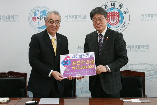 후지제록스 우에노 야스아키 사장이 4일 오전 목원대학교를 방문해  박노권 총장과 학교 관계자들이 참석한 가운데 박노권 총장에게 대학발전기금 7,000만원을 전달했다.