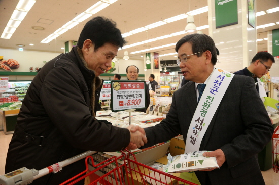 서천군은 지난 12일 롯데마트 대덕점에서 노박래 군수, 서래야친환경연합회 노기래 회장 등 15명이 참여해 소비자들에게 서래야쌀(1kg)을 직접 나눠주며, ‘서천군곡물대전’ 판촉행사에 나섰다.