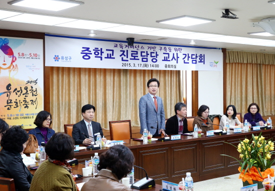 유성구가 17일 구청 중회의실에서 허태정 유성구청장과 일선 중학교 진로담당 교사 등 20여 명이 참석한 가운데 진로담당교사 간담회를 개최했다.
