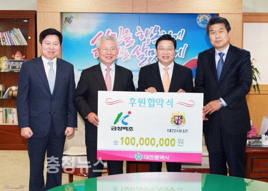 대전지역 중견건설사인 (주)금성백조주택(회장 정성욱)은 18일(수) 대전광역시청에서 대전시티즌과 후원 협약식을 가졌다. 협약식에는 금성백조주택 정성욱 회장과 정대식 부사장 그리고 이창종 전무, 대전시티즌 구단주 권선택 대전광역시장, 대전시티즌 전득배 사장, 정관성 대전시문화체육국장이 참석했다.