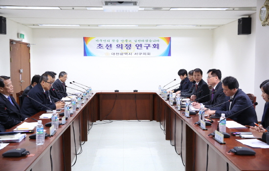서구의회(의장 박양주) 제7대 초선의원들로 구성한“초선의정연구회”는 3월 25일 오후 1시 30분 서구의회 3층 간담회장에서 송석근 부구청장을 비롯한 간부공무원, 의회를 사랑하는 모임 김정미 회장 등을 초청하여“집행부와 의원 간의 상호역할에 대한 고찰”의 주제로 지방의회의 감시와 견제를 넘어 소통과 화합을 위한“스마일 대화방”의 소중한 시간을 가졌다.