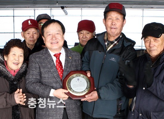 ▲ 도마게이트볼 회원들로부터 감사패를 받고 있는 김경시 의원