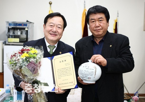 ▲ 신계어린이 공원을 조성해 신계초등학교 교장으로부터 공로패를 받는 김경시 의원