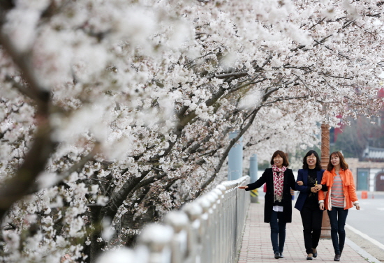 서산시 해미면 해미천 일대에 벚꽃이 만개했다. 9일 서산시에 따르면 해미천변 2.2Km의 가로수길 300여 그루의 벚나무가 최근 일제히 꽃을 활짝 피웠다.