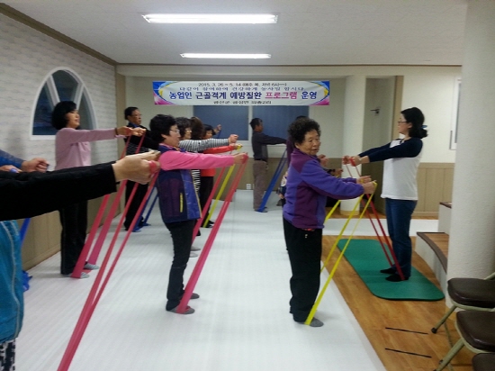 금산군농업기술센터(소장 장정호)는 지난달 26일부터 다음달 14일까지 금성면 의총2리 마을회관에서 마을주민 30명을 대상으로 근골격계질환 예방운동을 진행하고 있다고 밝혔다.