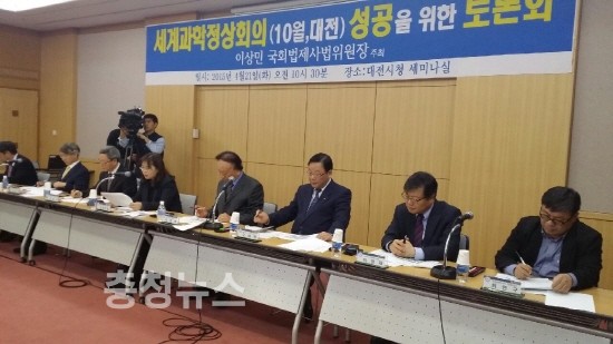 이날 행사는 이상민법사위원장의 인사말에 이어 권선택 대전시장과 김인식 대전시의회 의장의 축사, 그리고 김꽃마음 세계과학정상회의 준비기획단 부단장이 주제발표와 좌장인 이영호 한국과총 대전회장의 진행으로 토론이 진행됐다.