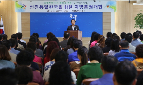 대전 동구(구청장 한현택)는 29일, 구청 중회의실에서 주민들과 공무원 등 140여명이 참석한 가운데 ‘선진통일한국을 향한 지방분권 개헌’이란 주제로 ‘동구아카데미’를 개최했다.