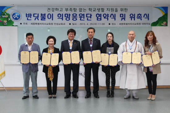 세종특별자치시교육청(교육감 최교진, 이하 세종시교육청)은 29일 취약계층 및 결손가정 자녀 학생들의 안정적인 학교생활을 지원하기 위해 ‘2015 반딧불이 희망응원단 협약식 및 위촉식’을 개최했다고 밝혔다.