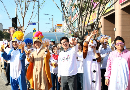 유성구가 ‘2015 유성온천문화축제’를 9일 앞둔 30일 온천역네거리에서 허태정 유성구청장과 공무원 등 300여 명이 참석한 가운데 출근길 직장인을 대상으로 거리 홍보를 펼쳤다.