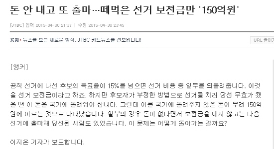 JTBC는 이날 선거법 위반으로 당선무효형이 확정된 정치인들 중 선거보전금을 돌려주지 않은 인물들을 언급 보도하며 대전시의회 김동섭 시의원을 모자이크 된 자료 화면으로 내보내 충격을 주고 있다.
