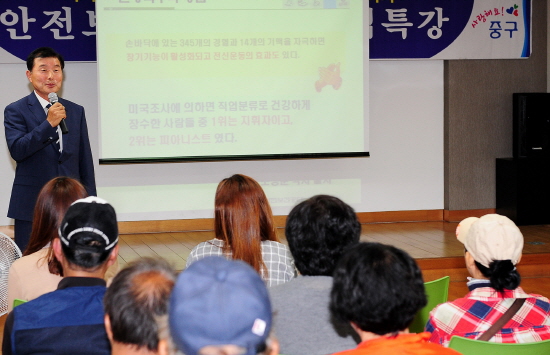 대전시 중구(구청장 박용갑)는 7일 오후 2시 청내 보건지소 교육장에서 지역공동체일자리 및 공공근로 사업 참여자 및 사업담당자 등 60여명을 대상으로 한국산업안전보건공단 강사 초빙 안전교육을 실시했다.