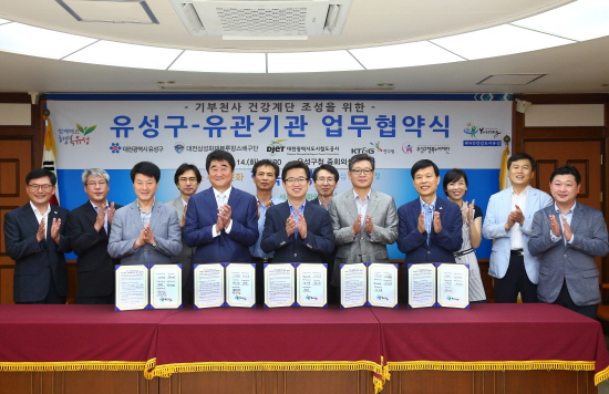 유성구는 14일 구청 중회의실에서 기부천사 건강계단 조성을 통한 주민 건강증진과 이웃사랑 나눔문화 활성화를 위한 업무협약을 체결했다.