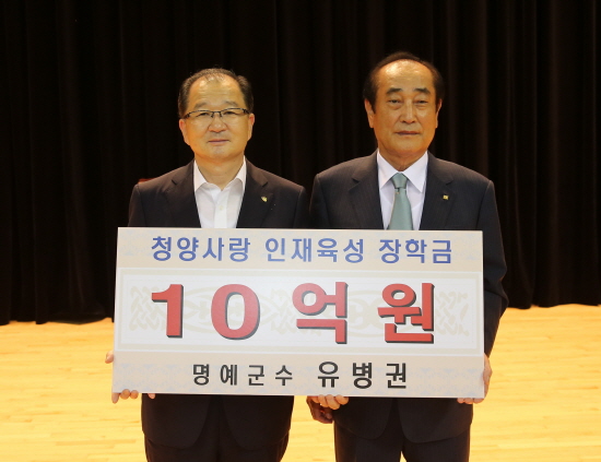 청양군 유병권 명예군수가 24일 새마을남녀지도자·이장 화합한마당대회가 열린 자리에서 장학금 10억원을 기탁하면서 현재 190억을 조성해 2011년 출범한 청양사랑인재육성장학회(이사장 이석화 군수)의 목표 달성을 향해 큰 걸음을 뗐다.