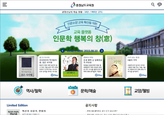 충남도교육청(교육감 김지철)은 인문소양교육 확산을 위한 교육플랫폼인‘인문학 행복의 창(窓)’을 개설하여 20일부터 도내 교원을 대상으로 시범운영을 거쳐 9월부터 본격적인 운영에 들어간다고 밝혔다.