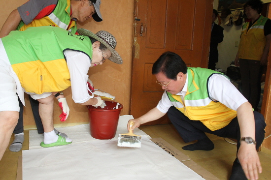 ▲ 장종태 서구청장이 자원봉사자의 도배를 돕고있다.