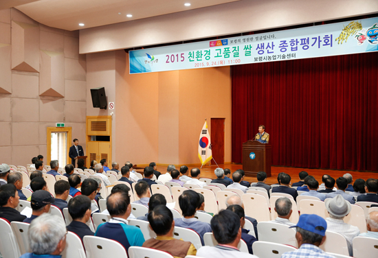 충남 보령시(시장 김동일)가 24일 농업기술센터 농업교육관과 벼 신품종 비교전시포장에서 김동일 시장을 비롯 농업관련 기관·단체 관계자, 농업인 등 280여명이 참석한 가운데 ‘2015년 친환경 고품질 쌀 생산 종합평가회’를 가졌다.